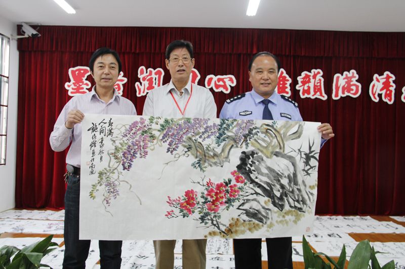 书画家们在监狱阅览室挥毫泼墨。运笔构思间,或工或写,或勾或染,细腻或豪放的笔触间,一幅幅潇洒的墨竹、端丽的紫藤、洗练的墨松跃然入画,一帧帧水墨淋漓、简练俊逸的书法晕染纸上。《春风化雨、润物无声》、《厚德载物》、《自强不息》等现场创作的30多幅书画作品,集正草隶篆、山水人物、花卉草虫、飞鸟走兽之美,风格或虚灵俊逸、或清雅宏阔、或遒劲顿挫,充满了生命力,将书画家们深厚的国学功底、对艺术本质的深刻理解淋漓尽致地体现在作品上。为现场观摩学习的民警、服刑人员展示了一个情韵美、情趣美的艺术天地。